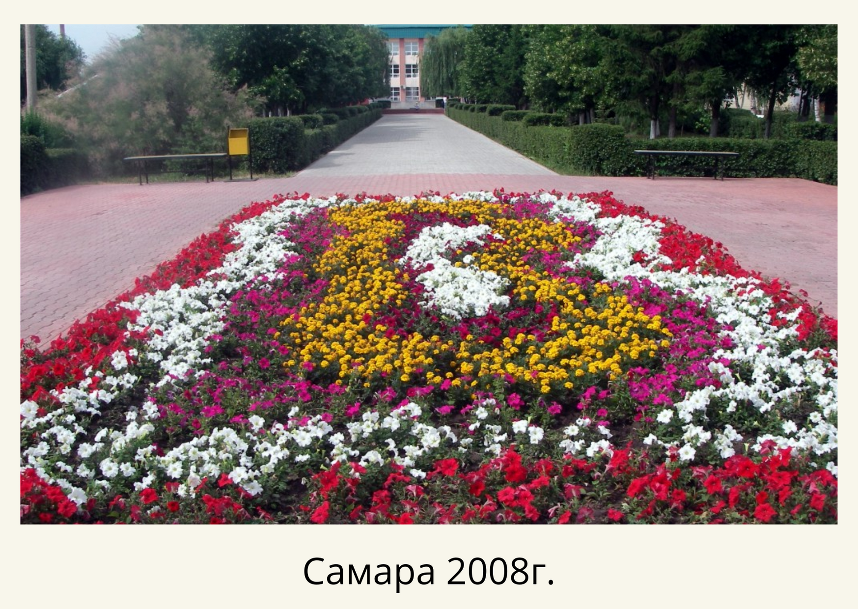 Территория центральной аллеи включает 16 правильных геометрических цветников. Из предложенных 18 вариантов эскизов заказчиком были утверждены шесть рисунков клумб с условием их чередования. В процессе осуществления посадок у нас возникали новые идеи, которые мы на месте обсуждали с заказчиком и в результате вместо запланированных 6 вариантов цветников мы получили 12, т.е. только 4 рисунка клумб повторялись. На центральном участке со стелой мы воссоздали логотип предприятия.
